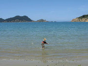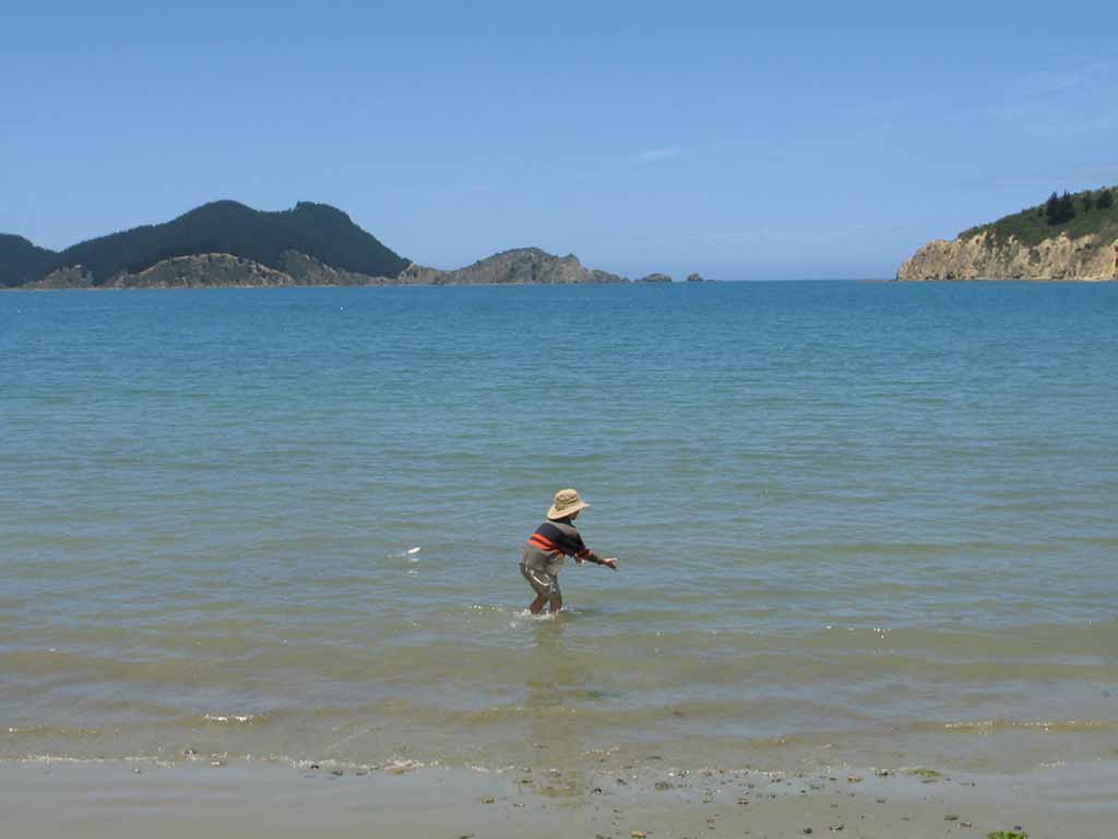 About 40 minutes up the road to Port Underwood is Ocean Bay, which is a very nice sheltered spot with a sandy beach. When we visited the Pohutukowa trees were in full bloom and it was easy to see why they are called New Zealand's Christmas Tree. We are looking forward to going back there, with kayaks. Here Zane is trying to herd some fish, but notice the one sneaking up from behind!