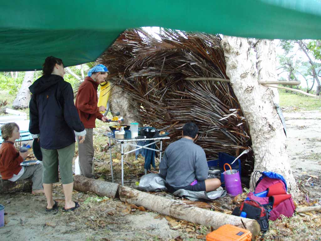 The next morning at the camp the wind had increased to the point that action was needed so that the stove could be lit for breakfast. We needed our coffee! The usefulness of the coconut tree is once again displayed.