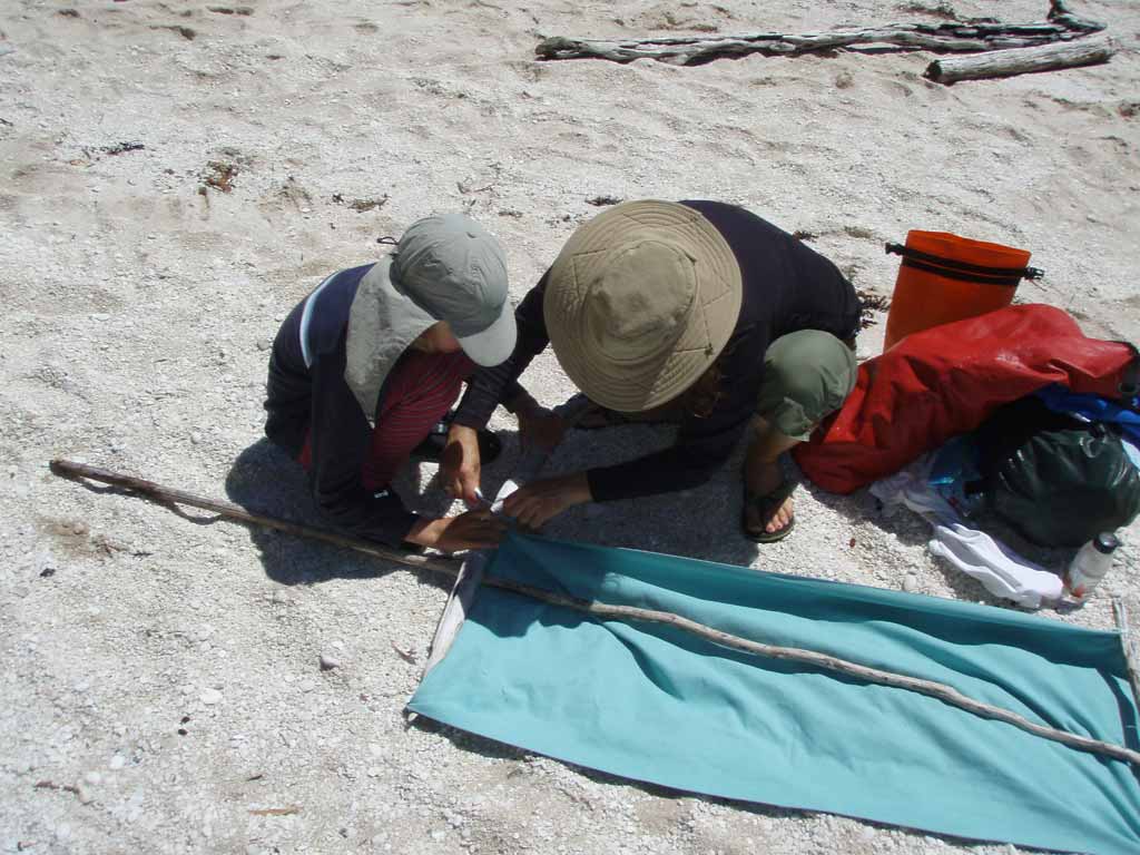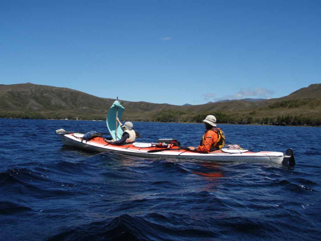 The weather prediction was for a following wind on our return paddle. Zane thought a sail would be useful in these conditions, so he set to work (with a bit of help from Mom).