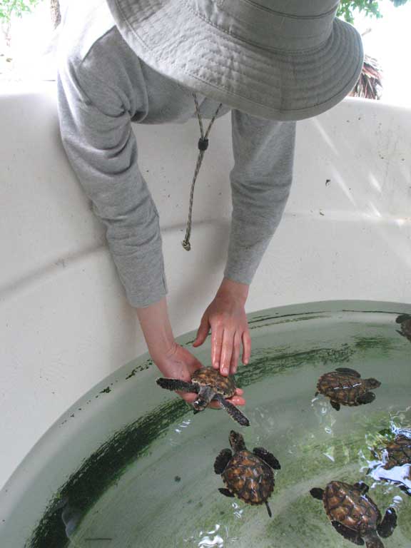 We're not sure where this ranks on the range of turtle conservation practice, but it sure was fun to play with the little turtles! Local eggs are hatched and the turtles are raised until they are about 1 year old, hoping to improve the survival rate of the hatchlings. In the wild perhaps 1-3 of 100 will reach adulthood.
