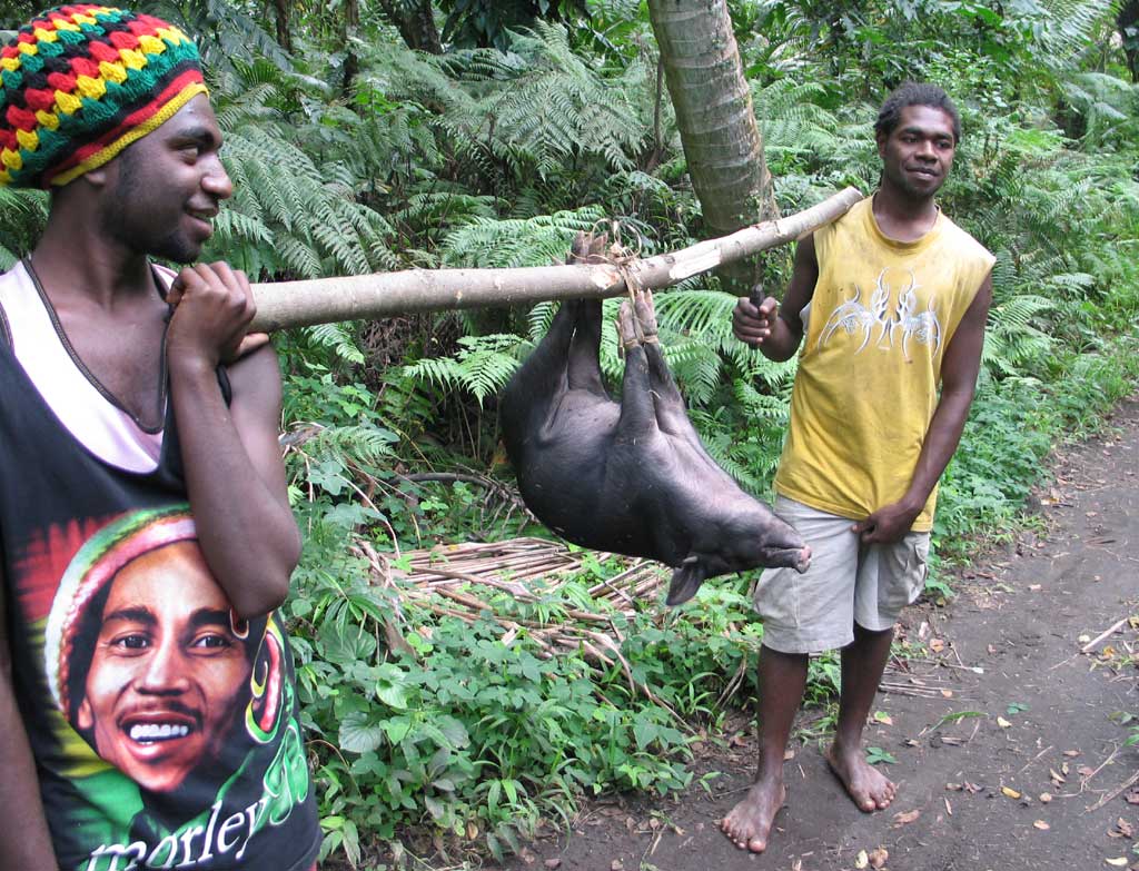 While the drivers ran a couple errands, we checked out the market in the big town of Lenakel (they have electricity!), where we ate some terrific local food and bought some more fruit. When the boys came back there were a couple chickens riding in with our bags. We thought this was unique until the next morning on our flight back to Port Vila, when there were chickens and a pig checked in as baggage.