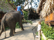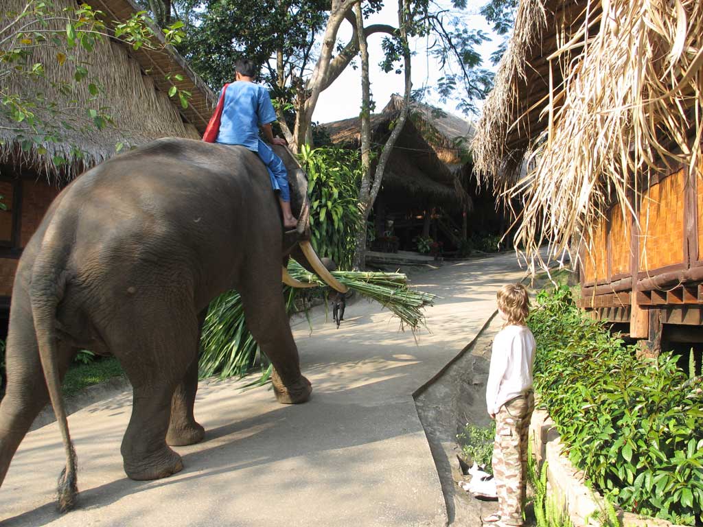 Our accomodation was right in the village where the mahouts and other camp workers lived. They were nice and took great care of us. Here Zane watches as a mahout goes by on his way home from work. For some reason his elephant stayed near the village at night - most of the others were taken out to the forest to spent the night.