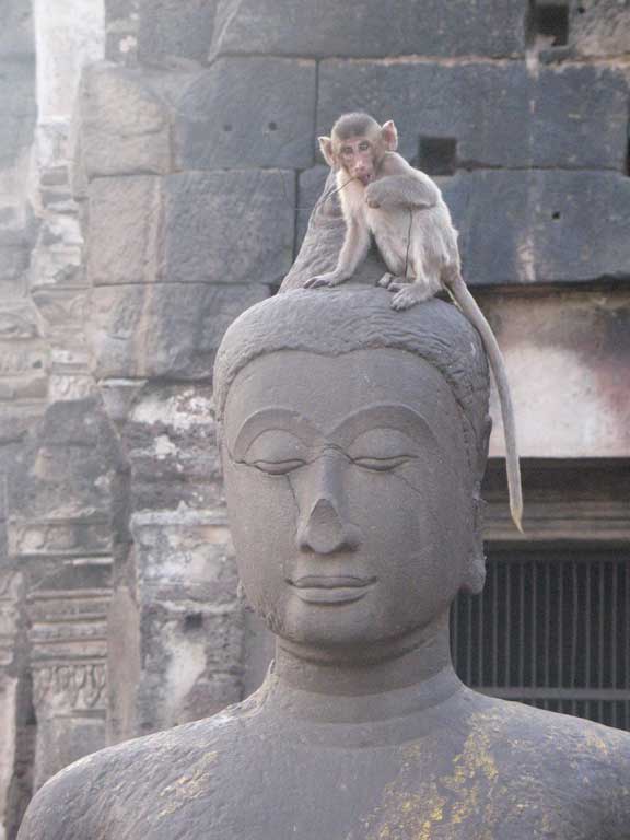 The monkeys roam freely through the area around town close to the ruins. All nearby buildings are appropriately fortified for protection, and all nearby shopkeepers are armed with bamboo sticks to keep the monkeys out of trouble.