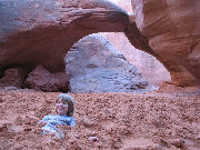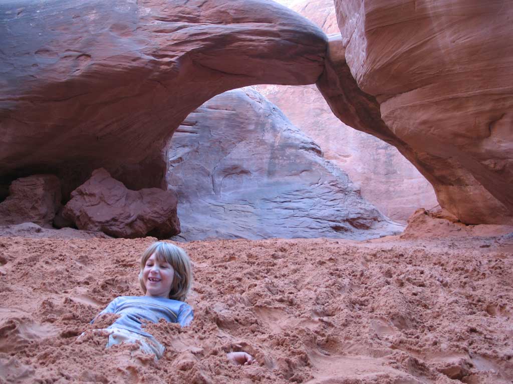 Back at Arches National Park, Zane checks out the sand under Sand Dune Arch.