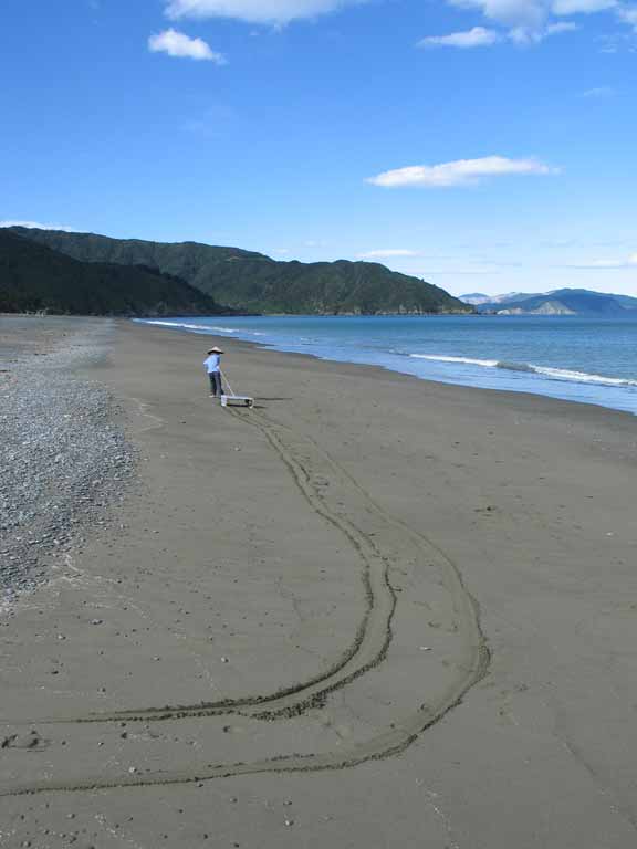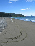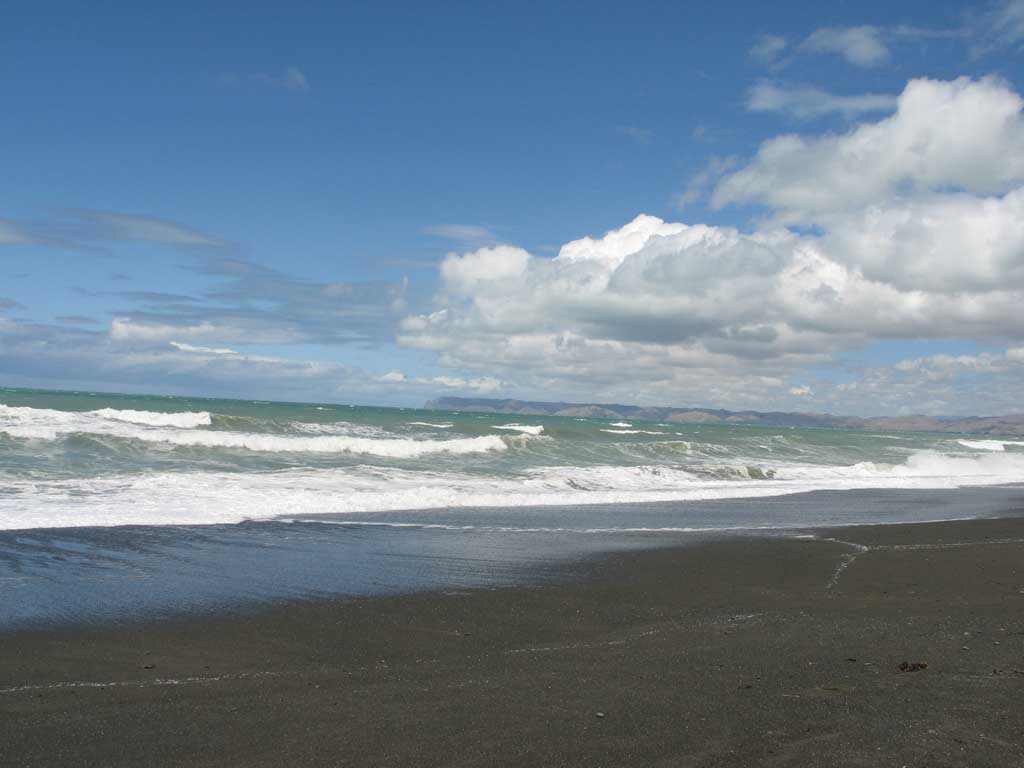 Week 3: We examined MANY houses, looking for that perfect "character" house (privacy, room for sheep). We did not find it, but did find the beach community of Rarangi, about 1/2-way between Blenheim and Picton. We visited the school, talked with some residents, and got a good feeling about it. We put in an offer on a house there - it was accepted! Glenn is happy - right across the street from the Golf Course. If all goes to plan we will be in before Christmas. Plenty of room for guests -make your travel plans now. Here's the beach there on a blustery day.