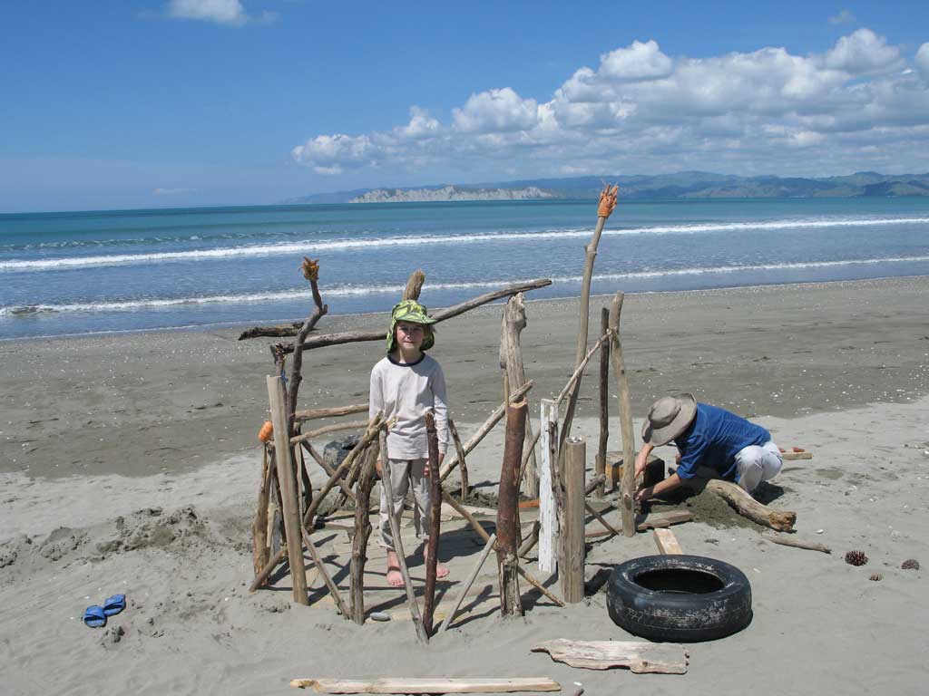 Zane has begun several projects, including a remodel of the garden shed into his play house. Here he tests out his new sand sled on the beach. It is good for hauling driftwood and interesting beach rocks.