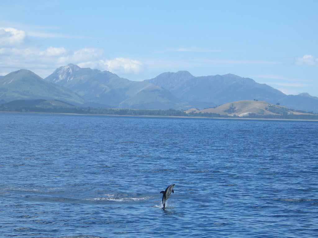 We took a day trip down the coast to Kaikoura to go whale watching. We were very lucky, as the gale force winds did not arrive until our tour was over. The cetaceans also cooperated, as we saw two Sperm Whales, Dusky Dolphins, and the endemic and rare Hector's Dolphins. Since they always seem to be having so much fun we agreed in a future life we would like to come back as dolphins.