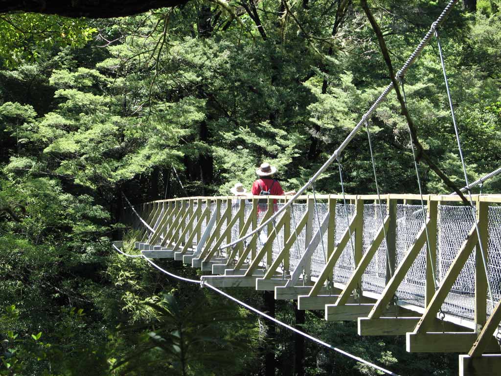 Swing bridges are fun! This swing bridge is at the Pelorus Bridge Scenic Reserve, a great place for a stroll or swim. Zane and Glenn went swimming, but Tana chickened out and stayed on shore.