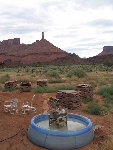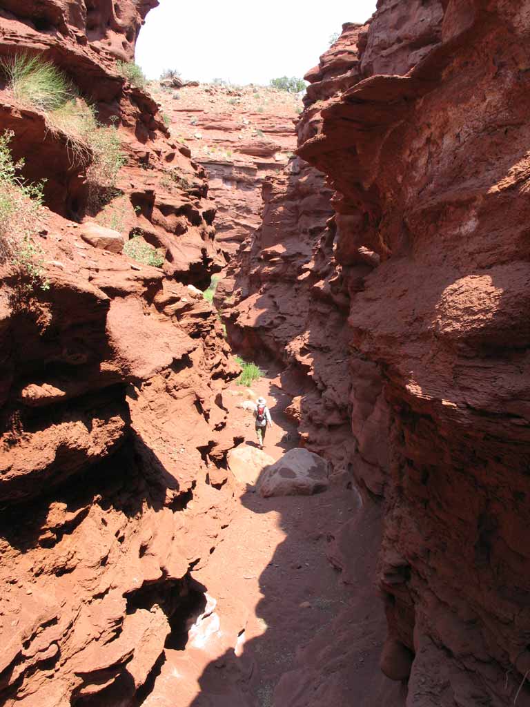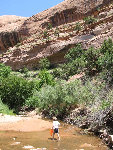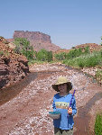 We visited nearby Professor Valley for a several hikes. There are some nice narrow sections and the creek is good for keeping cool on a hot day. Here Tana explores a scenic side-canyon.