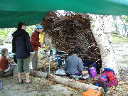The next morning at the camp the wind had increased to the point that action was needed so that the stove could be lit for breakfast. We needed our coffee! The usefulness of the coconut tree is once again displayed.