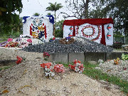 Graveyards in Tonga are generally festive affairs, and often have pigs and chickens wandering through them as well. The quilts are particularly striking. They are placed on the grave at the time of interrment and are left to deteriorate in the elements.