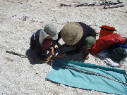 The weather prediction was for a following wind on our return paddle. Zane thought a sail would be useful in these conditions, so he set to work (with a bit of help from Mom).