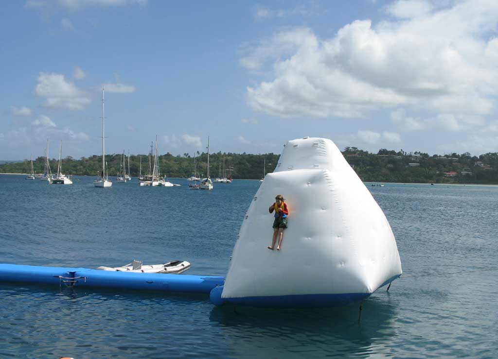 Port Vila has a wide range of touristy activites to keep the visitors happy, from helicopter tours to "priate" ships, to hair braiding. Zane enjoyed this harborside water park. Mom and Dad enjoyed watching.