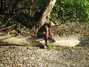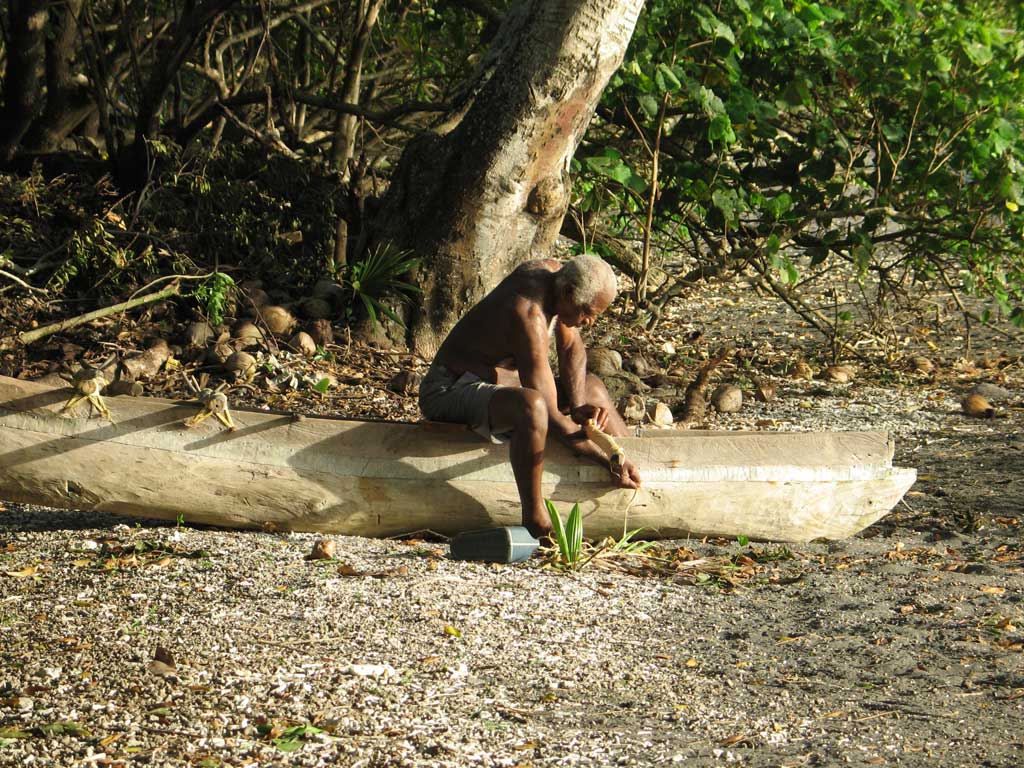 We spent a day at Lamen Bay, hoping to swim with the local Dugong, or sea cow. Unfortunately for that goal we literally missed the boat in the afternoon and had to wait until the next morning to go in search of the Dugong. We spent a relaxing day walking the beach and village, and swimming. A few hundred people live on Lamen Island in the bay and commute in boats or dugouts to the main island to tend their gardens, etc. Here a man installs a new strut on his dugout.