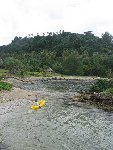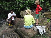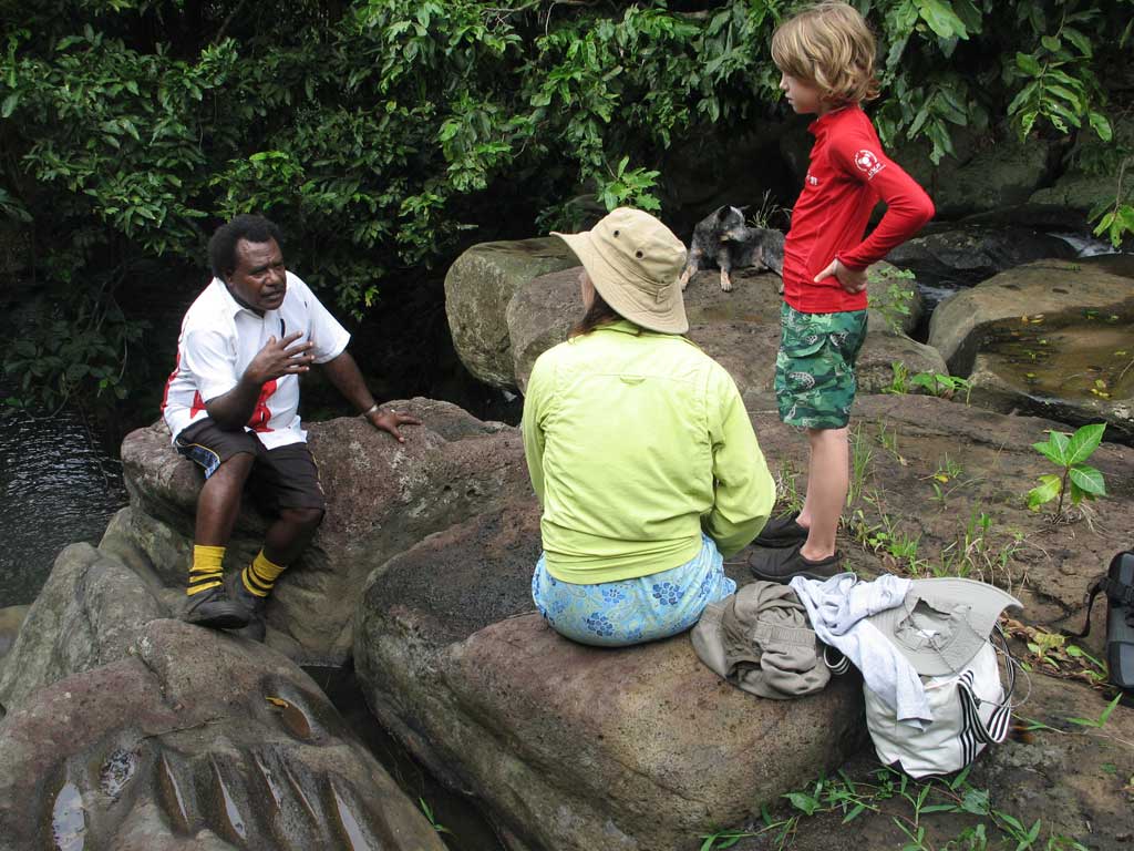 Louis, the chief of the local village, took us for a walk up to the nearby waterfall. Here he gives us a little bit of the local history, describing how his ancestors used the boulder he's got his foot on to sharpen their stone knives. The swimming was great too, with the prawns nibbling our toes.