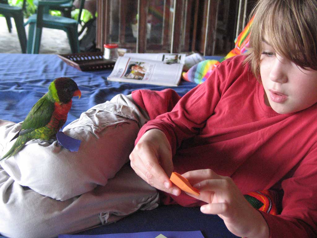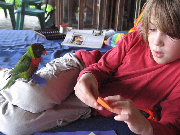 Zane loved playing with the dogs, the cat, and especially "Matey" the resident young semi-tame Lorikeet. It wanderes free during the day, returns at cocktail hour, and happily sleeps in its cage at night.