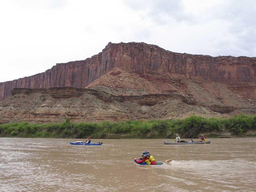 With our heavily laden flotilla of two canoes and three kayaks, we headed down the calm waters of the Green River. Zane rapidly dicovered it was at least as fun to swim as it was to paddle.