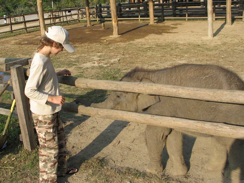 Our accomodation was right in the village where the mahouts and other camp workers lived. They were nice and took great care of us. Here Zane watches as a mahout goes by on his way home from work. For some reason his elephant stayed near the village at night - most of the others were taken out to the forest to spent the night.