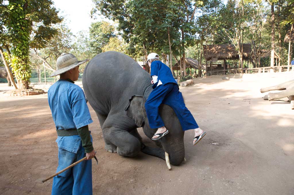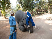 The next day we donned our mahout suits and went to class. Here we learned 3 ways to get on and off the elephant, as well as several commands to control the elephants. Here Zane shows some good form in getting up on the elephant by jumping onto his neck. The elephants were very patient with us.