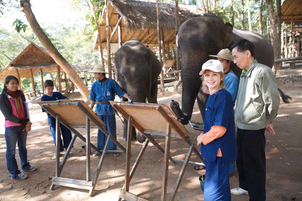 As well as performing a few tricks and putting on a demonstration of logging techniques, the elephants do a bit of painting as part of the show. Some are abstract artists, some take direction well and can be steered to writing letters and words.