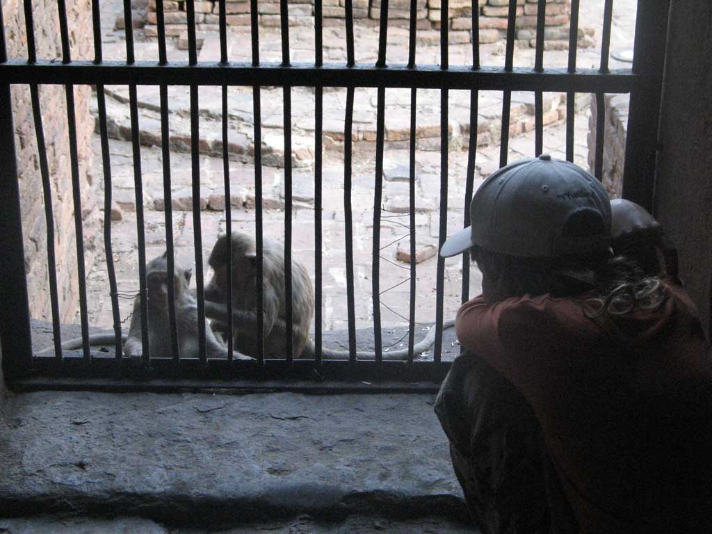 Who is inside the cage? Actually, the monkeys are on the outside. The gates are in place to keep them out of the ruins. Now we know what it's like to be on the inside of a cage being stared at!