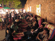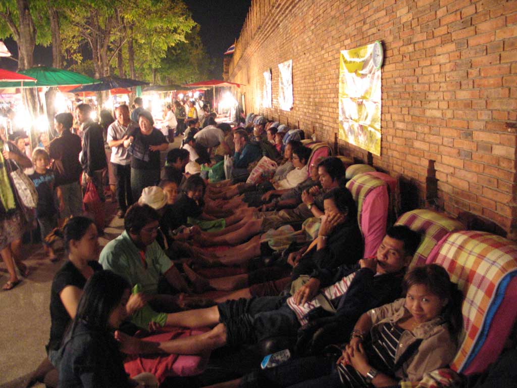 People getting foot massages at the walking market in Chang Mai.