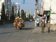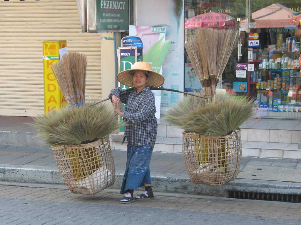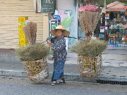 Sometimes the market comes to you. This woman is peddling brooms. I would guess she does a good business, as it seems that people are constantly sweeping in or in front of their business establishments.