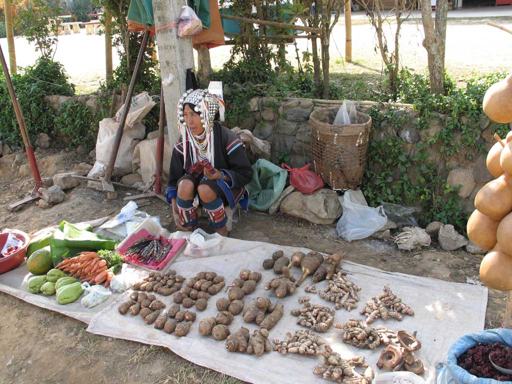 A Hill Tribe woman peddling foodstuff at the market in Mae Salong. Although wearing the traditional costume was likely mostly for the visitors' benefit, we did see people walking around in this attire as part of their everyday business.