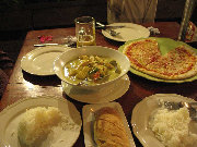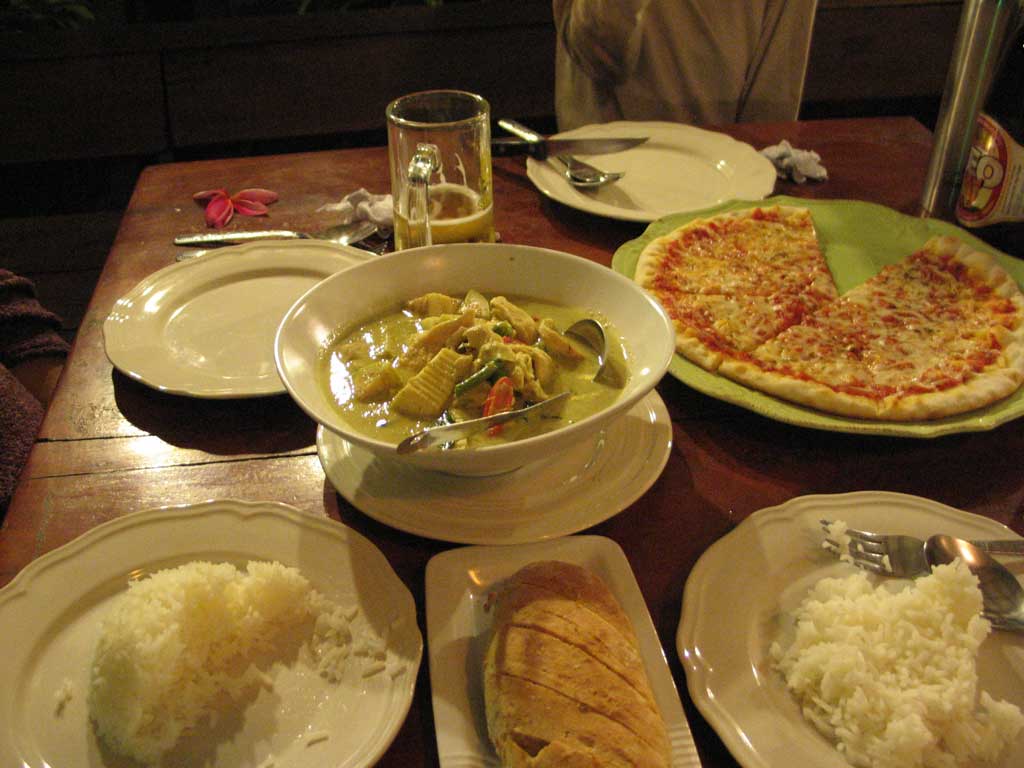 Thai curry, rice, pizza and garlic bread - a meal to make mom, dad, and Zane happy.