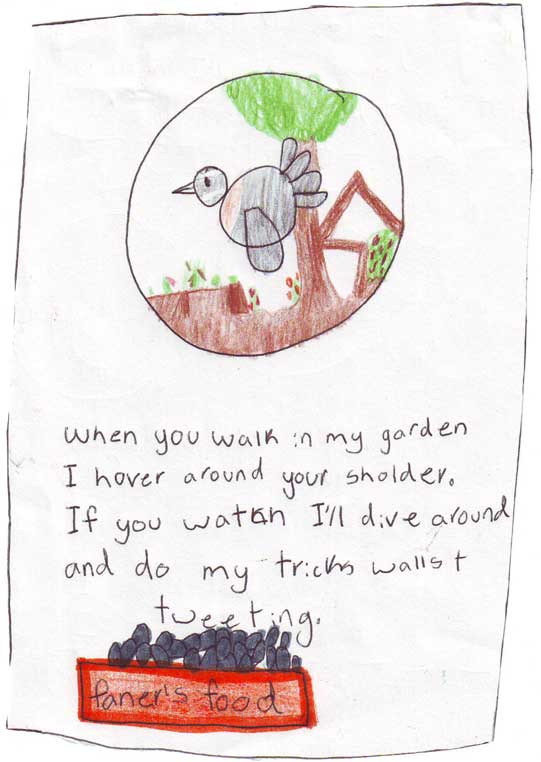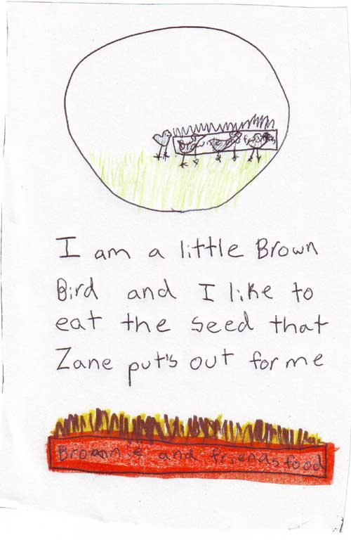 I am a little brown bird and I like to eat the seed that Zane puts out for me.